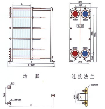 框架包括一個固定壓緊板和一個活動壓緊板,由上導桿與下導桿支承,在另‘端有一支柱。壓制成的波紋板片懸掛在兩板之間的上導桿上,移動活動壓緊板將板片組壓緊,再用一組夾緊螺柱將固定壓緊板和活動壓緊板夾緊至一定尺寸。兩種介質經固定(或活動)壓緊板上法蘭孔流入由波紋板片組成的各自通道,熱交換后介質再由固定(或活動)壓緊板上的法蘭孔流出。同定壓緊板、活動壓緊板、支柱及導桿均為低碳鋼??紤]到用戶的多種使用要求,框架設計有多種型式,主要有雙支撐框架式和常用的落地式等,也可根據用戶的要求更改框架的型式。